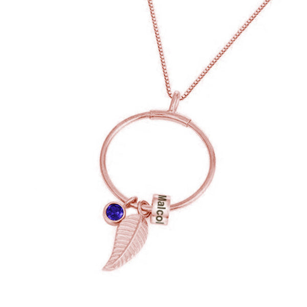 The necklace was designed to symbolize an everlasting circle.This alluring piece includes round beads which be customized however one pleases.As well,the necklace is adorned with a dangling leaf charm and a birthstone (12 color available). Other features include: