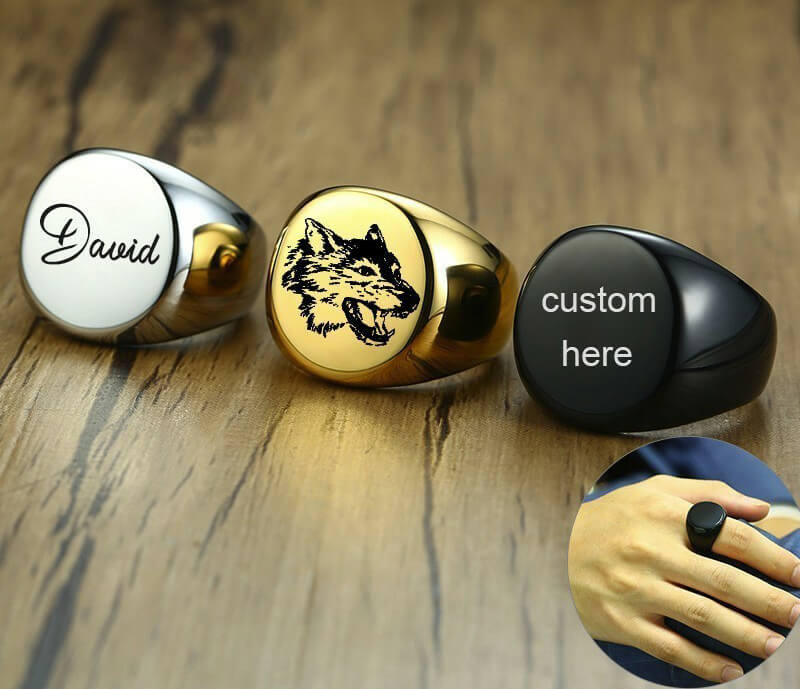 This Chunky Personalized Round Top Signet Ring for Men Ring Punk Boy Custom Ring is made of High Quality Stainless Steel. You can upload a file including the logo (the color only black,silver or grey) and text you design to engrave or only add the text you want to engrave on the flat top surface of the ring. Come and customize a personalized ring for yourself or the one you love.