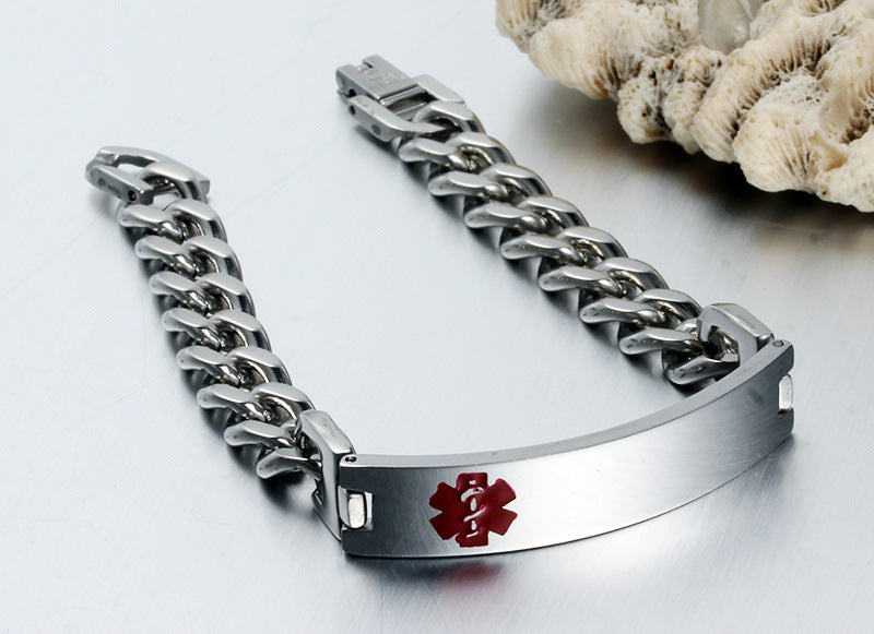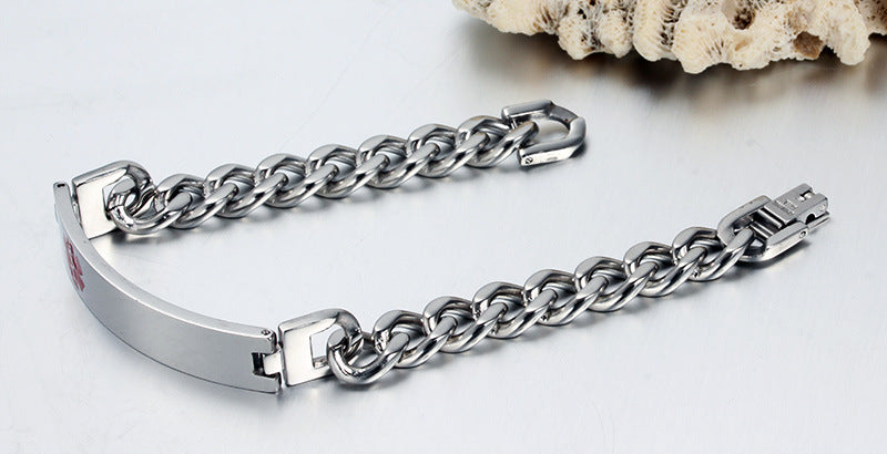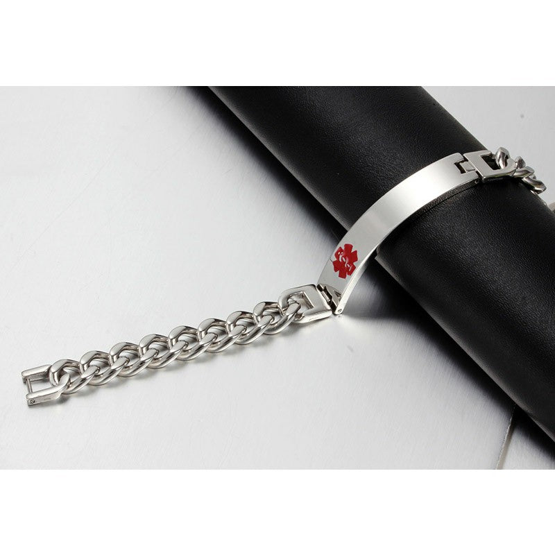 This Emergency ICE Medical ID Bracelet is a great choice. The round link chain will sit comfortably on your wrist. The front of the bracelet features a red medical symbol along with your custom engraving. A great way to alert the medical team of any allergies or illnesses. This bracelet includes the red caduceus already so go ahead and personalize today!
