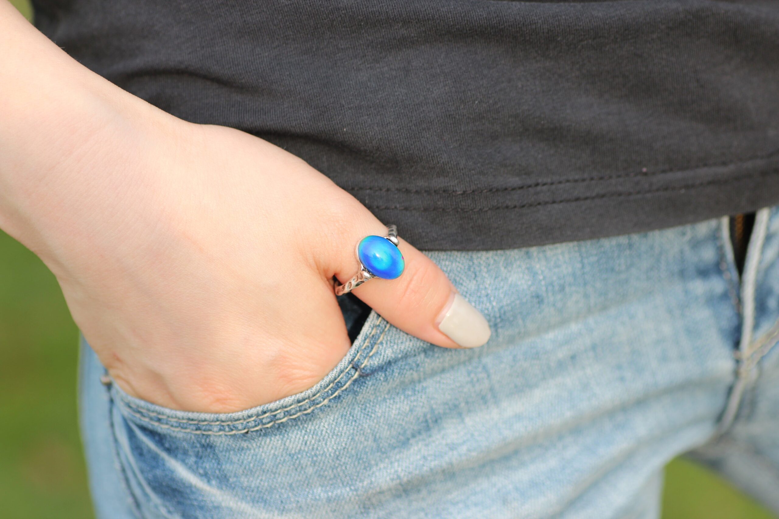 This is a retro real mood ring! This mood stone will change to a variety of colors based on your body temperature and ‘mood’.