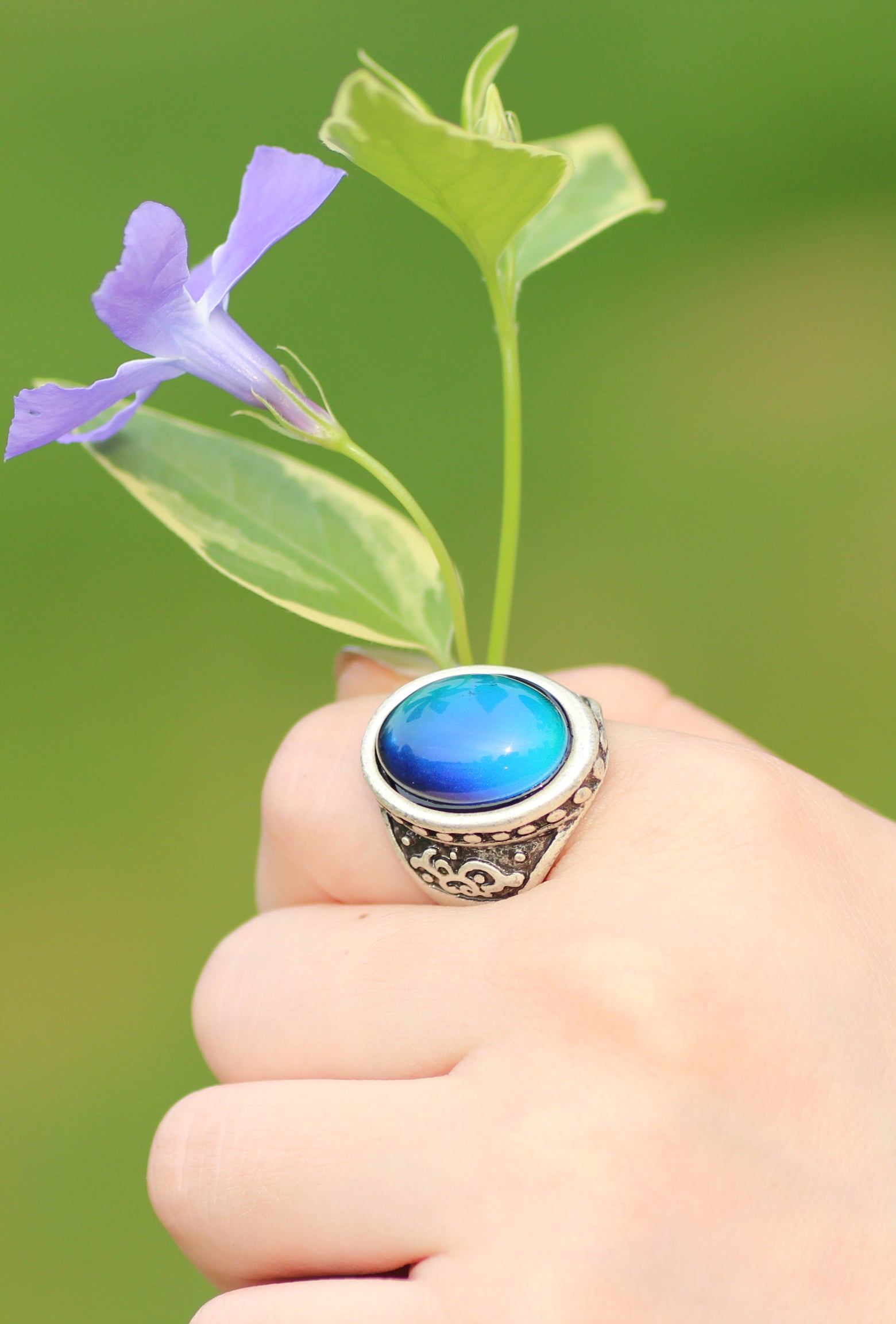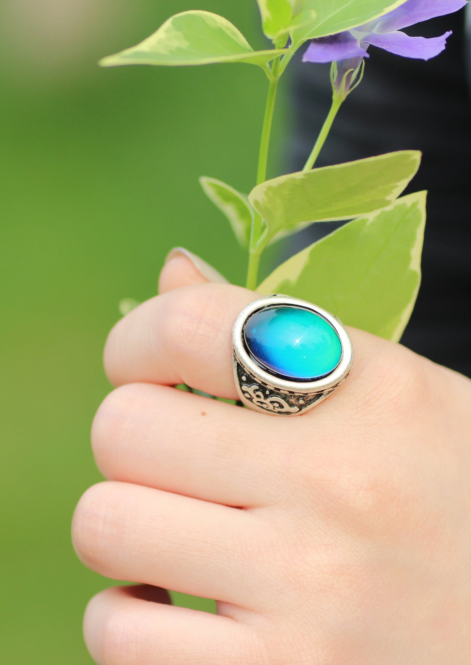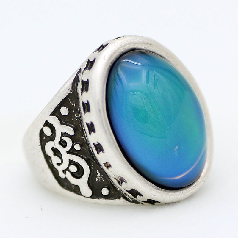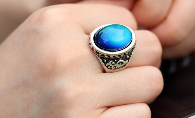 This is a retro real mood ring! This mood stone will change to a variety of colors based on your body temperature and ‘mood’.