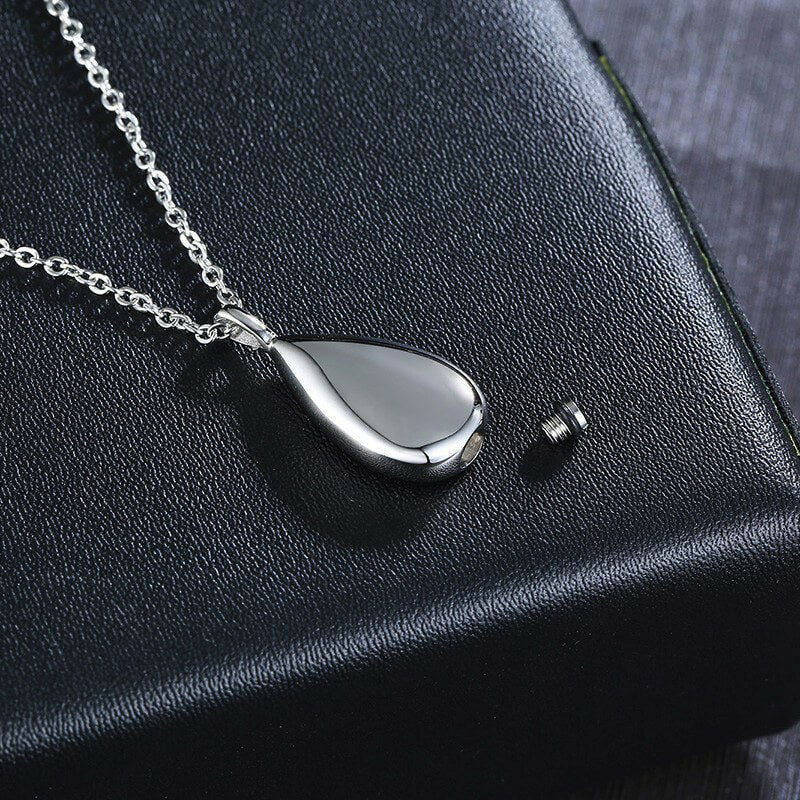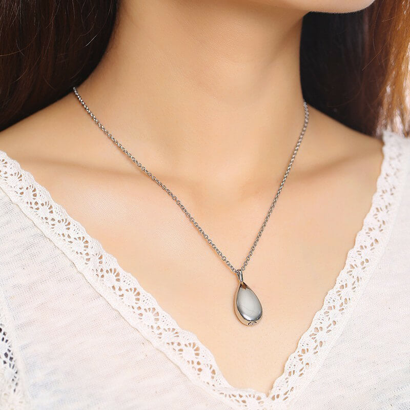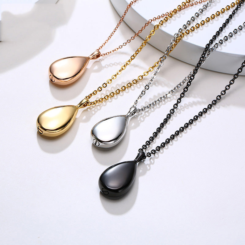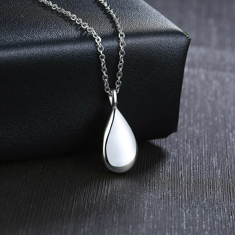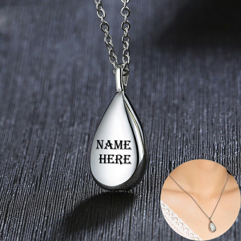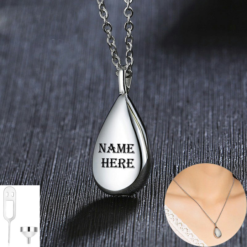 Keepsake Memorial Cremation Jewelry Necklace for Ashes Urn Pendant Carved Teardrop is remembrance jewelry used as a remarkable way to memorialize a loved one. It works perfectly for filling it with all kinds of things,like loved ones ashes,hair,nail,or other private items.Screw & rubber gasket secures a tight seal to keep your pet or human urn ashes.Single side of pendant could be free engraved,text up to 10 characters each line,three text lines in total.