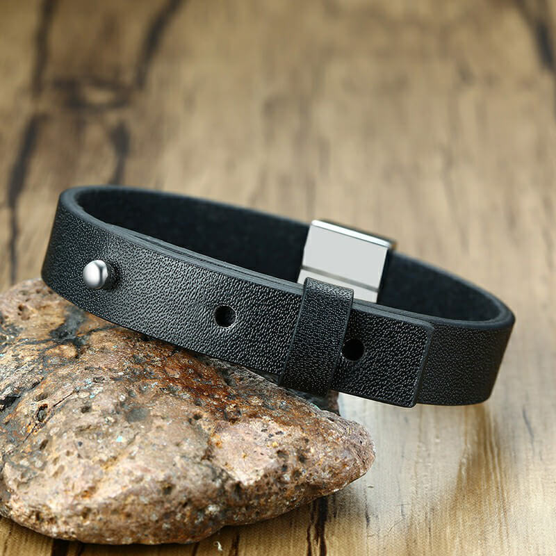Men’s Stylish Black Leather Personalized ID Bracelets