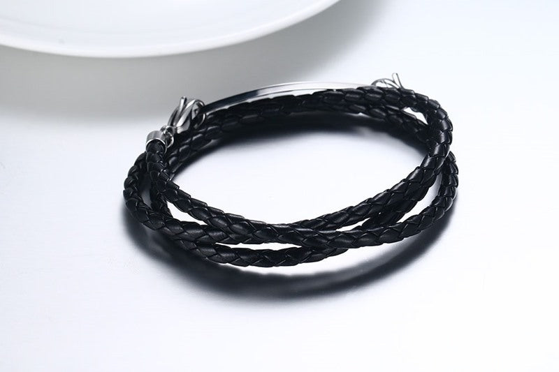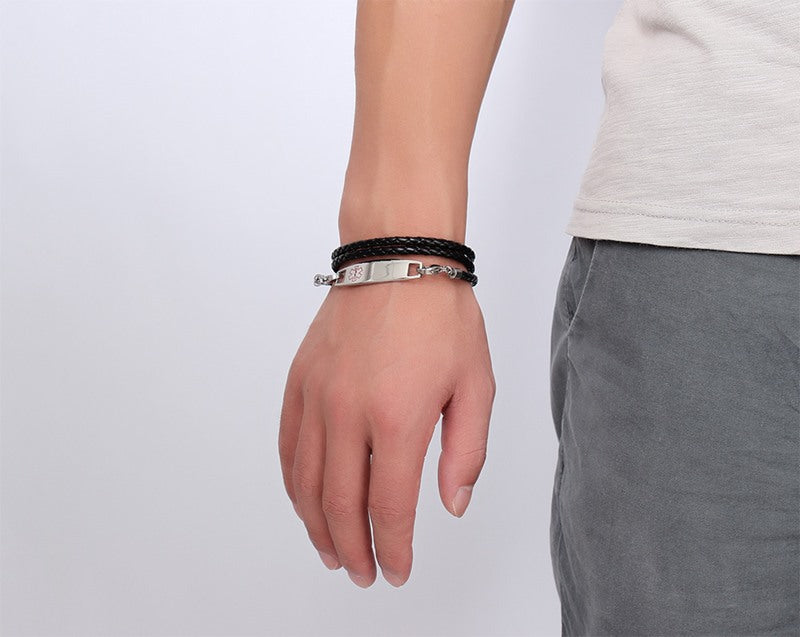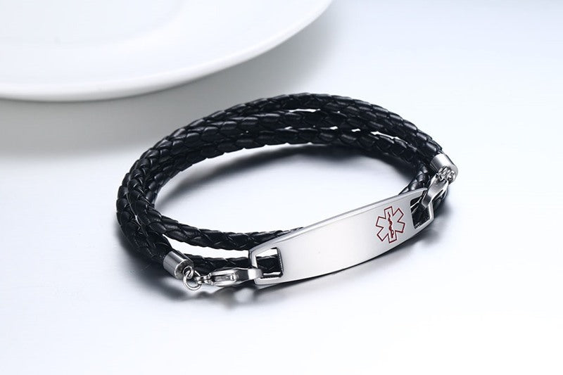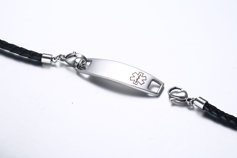 Black Leather Medical Alert ID Bracelets for Men Women Custom SOS Reminder Jewelry